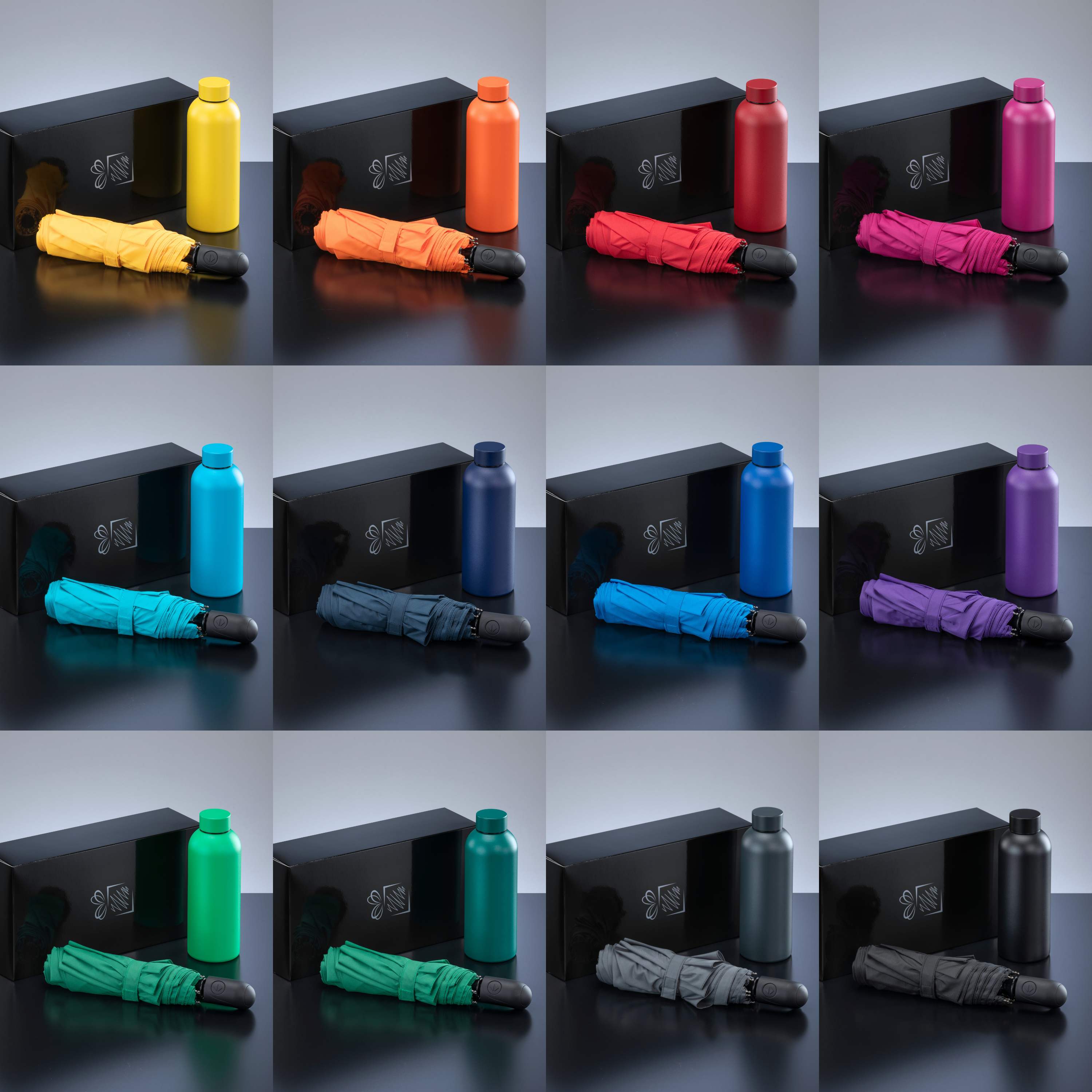 A practical set for people on the go, it includes a Nordic thermal mug and a foldable umbrella from Cambridge collection.\nThe Nordic thermal bottle is made of the highest quality 18/8 stainless steel from a Korean company POSCO. Resistant to acids and carbonates, it provides durability with a sleek aesthetic. The solid powder coated finishing ensures resistance to mechanical damage, and also guarantees a safe grip. A foldable umbrella with DAS function (automatic opening and closing system), it is resistant to mechanical damage thanks to the anti-wind system.\nThe set is available in various colors. Packed in an elegant black gift box.