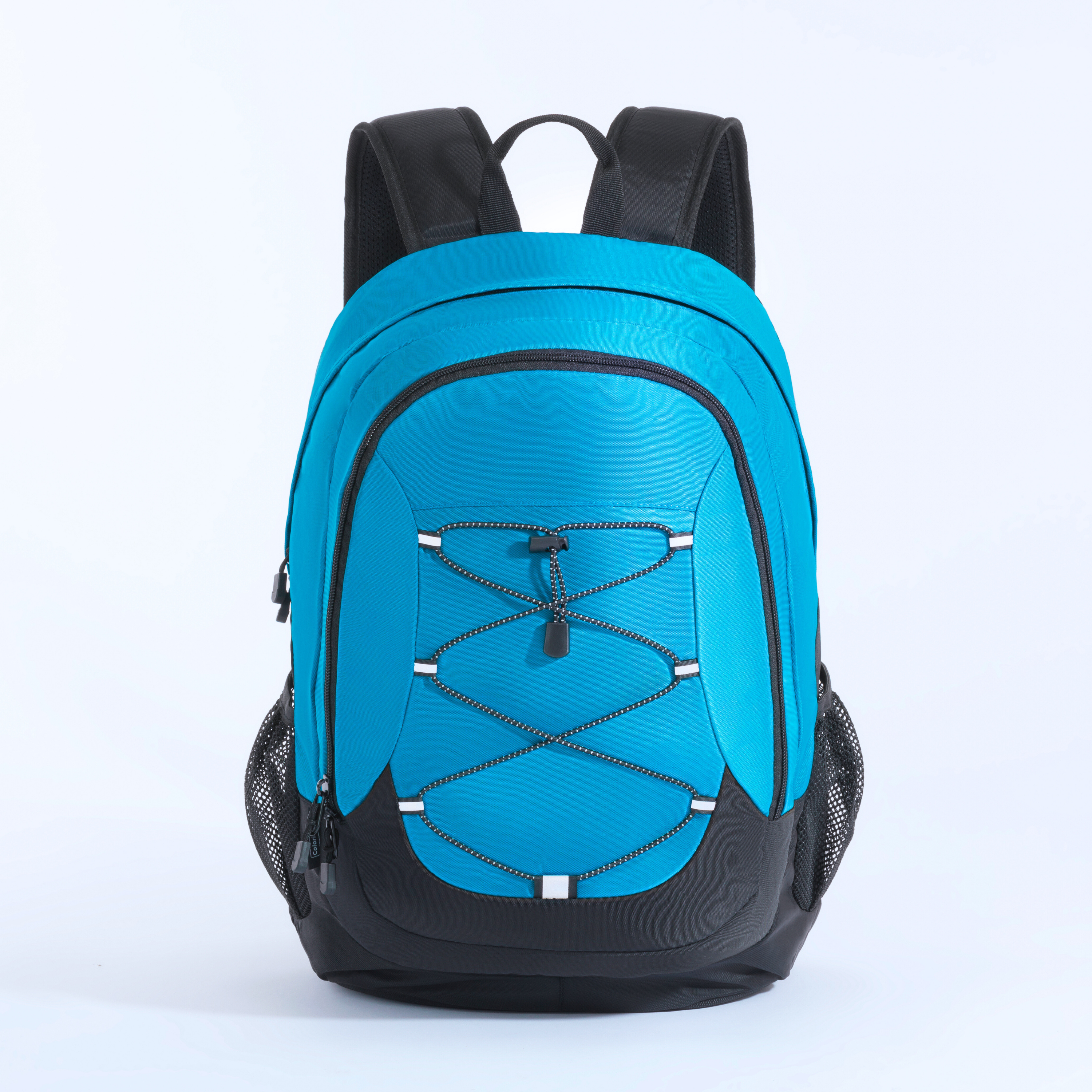 A functional sporty two-compartment backpack in a vibrant color with contrasting black panels on the bottom and sides. The front features an elastic bungee cord system for attaching additional gear. • Elastic bungee cords on the front allow quick attachment of lightweight items, such as a jacket or mat. • A reflective system integrated into the front of the backpack, ensuring the user's visibility at night. • Side mesh pockets are perfect for water bottles or other small accessories. • Ergonomic, ventilated back panel ensures breathability and comfort during use. • Padded shoulder straps ensure comfortable carrying. • A spacious main compartment with a zipper allows for storing various items, from documents to sports equipment. • Includes a dedicated laptop compartment, providing secure storage for laptops during travel or daily commutes. • Lightweight yet durable material, resistant to daily wear and moderate weather conditions. • Ideal for everyday use, hiking trips, school, or gym activities. • Capacity: 25L