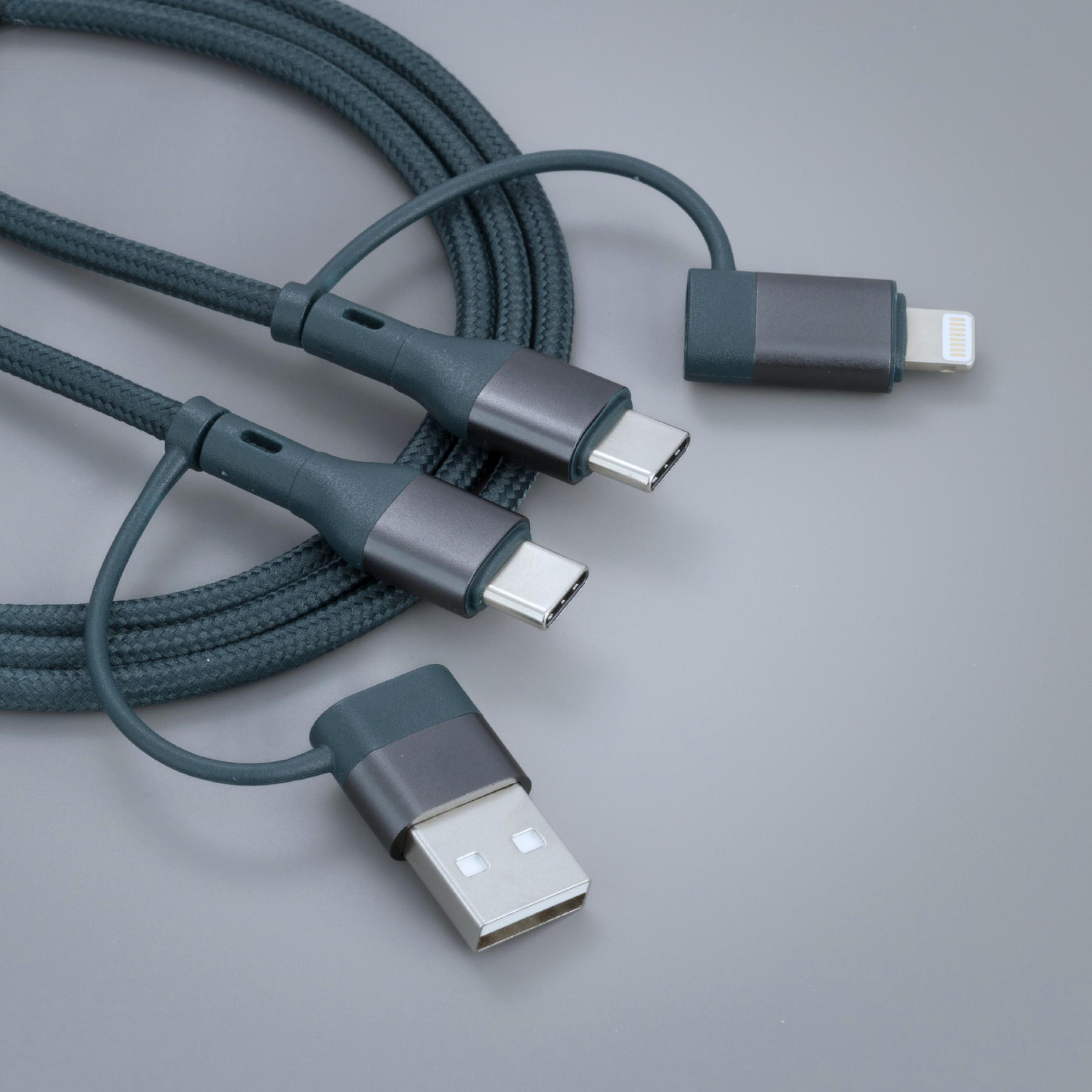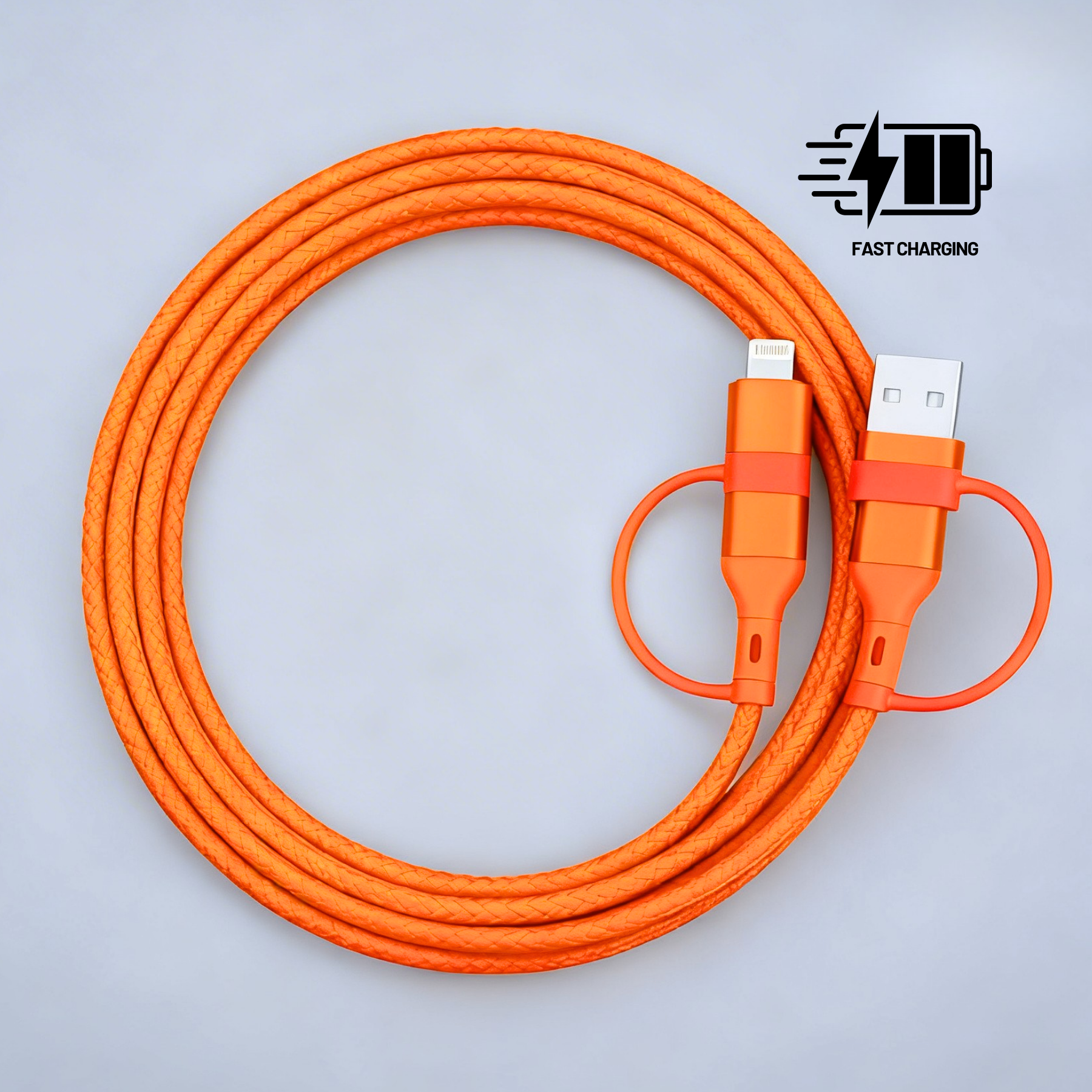 This colorful 4-in-1 charging cable with USB-A and USB-C inputs and USB-C and Lightning outputs supports fast 3A charging and stable USB 2.0 data transfer (up to 480 Mbps) in a durable 1.2 m woven design available in 10 colors. Reinforced with Kevlar, advanced shielding against EMI/RFI, and CE-EMC & RoHS compliance, it offers reliable everyday performance at home, in the office, or on the go.