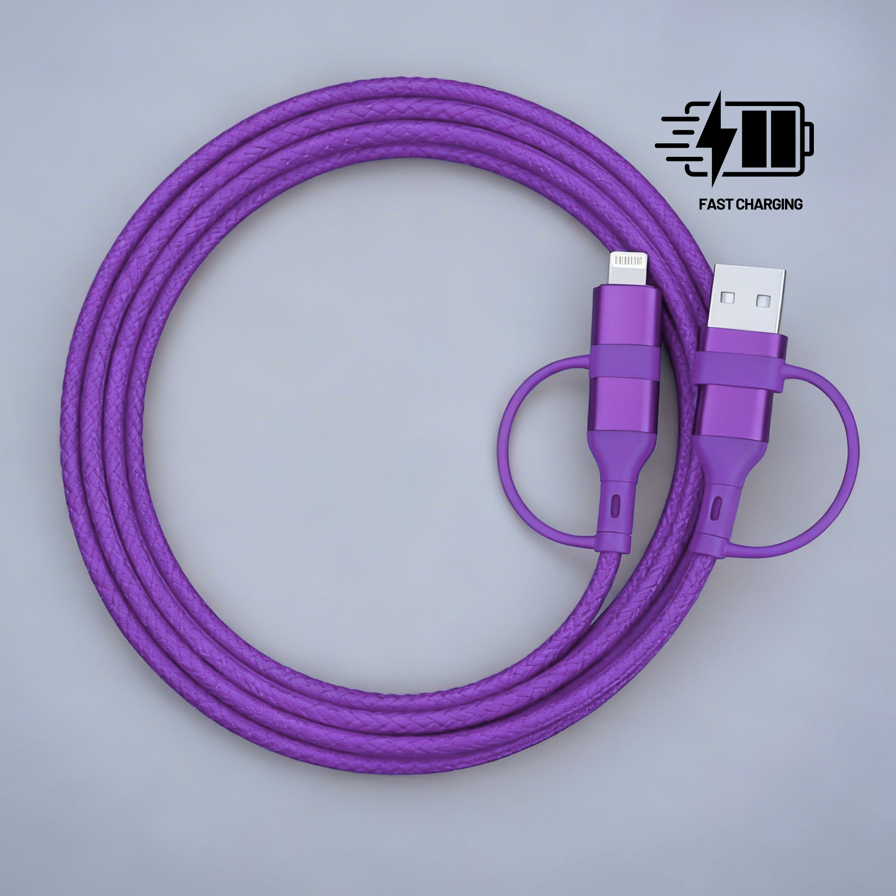 This colorful 4-in-1 charging cable with USB-A and USB-C inputs and USB-C and Lightning outputs supports fast 3A charging and stable USB 2.0 data transfer (up to 480 Mbps) in a durable 1.2 m woven design available in 10 colors. Reinforced with Kevlar, advanced shielding against EMI/RFI, and CE-EMC & RoHS compliance, it offers reliable everyday performance at home, in the office, or on the go.